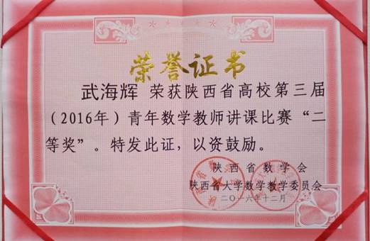 日前,陕西省数学会、陕西省大学数学教学委员会公布了“陕西省高校第三届(2016年)青年数学教师讲课比赛”的竞赛结果,公司教师武海辉、彭晓刚均荣获陕西省二等奖。