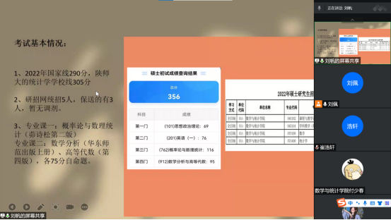 为加强员工对考研知识和经验的了解,营造积极向上的学风,2022年7月2日晚上,太阳成集团tyc33455举办了线上考研经验交流分享会,2019级有考研意愿的40余名员工参加了本次会议,分享会由2022年考研录取的李宇航等四名员工主讲,团总支书记刘佩主持。
