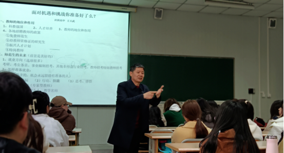 王玉武首先结合自己从教多年来的经历与现在关于师范生的相关政策,详细阐述了教师教书育人的重要地位与基础教育对民族发展的重要作用。随后,详细介绍了各地招聘教师的政策,并对师范生的未来前景给与了充分肯定,通过细致的讲解让同学们了解到师范生未来就业方向有很多,同时也教导大家该如何准备就业。与此同时王玉武也告诉同学们教师的终极目标是什么,希望大家在从事教师行业后能积极努力,争取做一名教学能手、学科带头人或者教学名师。最后王老师结合自己多年的经验给大家分享了班务心得,让大家对班务工作的内容、特殊情况的应急处理等方面知识有了进一步的系统掌握。