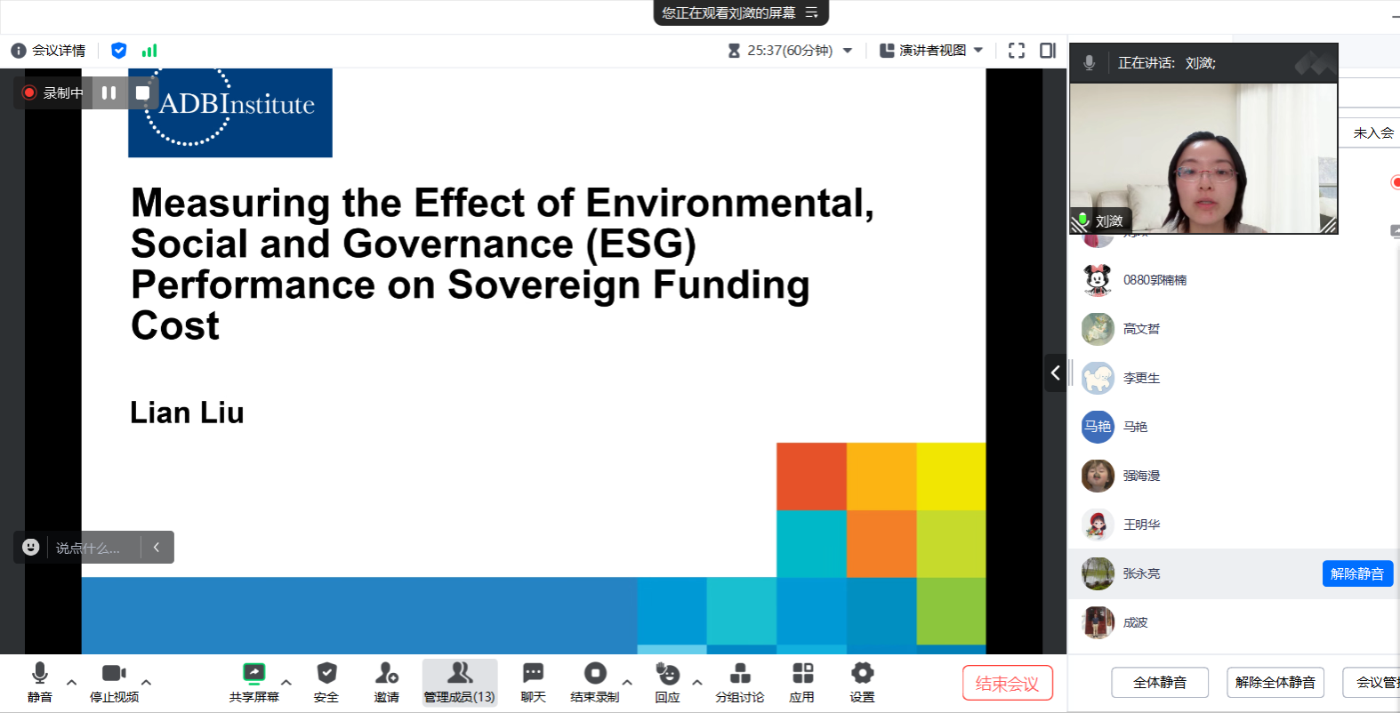 刘潋博士主要结合自己的研究内容——环境,社会,治理表现对国家融资成本的影响。报告内容为,通过对全球将近一百个国家的实证研究发现,全球范围内,ESG表现更好的国家融资成本更低。这个效果在亚太地区同样适用。由此可见,各国政府可制定促进国家ESG表现的相关的政策,以实现可持续发展的同时降低国家融资成本。