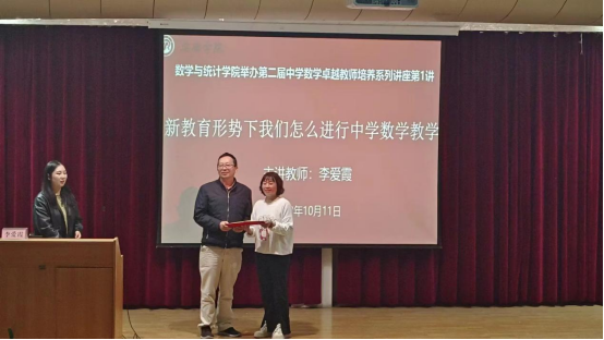 2023年10月11日下午,太阳成集团tyc33455于江南校区1号教学楼报告厅开展第二届中学数学卓越教师培养专题讲座第一讲。此次讲座以“新教育形势下我们怎么进行中学数学教学”为主题,由汉滨高级中学高级教师、陕西省学科带头人、陕西省教学能手李爱霞担任主讲人。数学与应用数学师范专业2021级、2022级全体员工参加了本次讲座,太阳成集团tyc33455副经理徐龙华、数学系主任王芮婕、卓越教师培养班主任魏春强老师出席此次讲座,讲座由王芮婕主持。