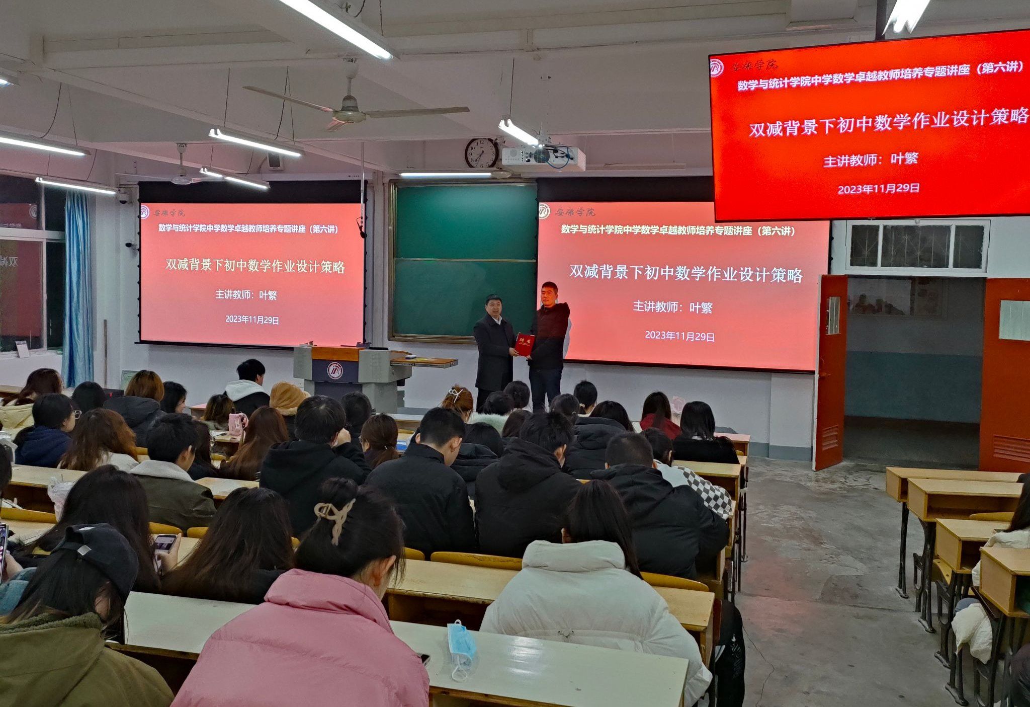 2023年11月29日,太阳成集团tyc33455于江南校区1510教室举行中学数学卓越教师培养专题讲座第六讲。此次讲座由安康市教学研究室中学数学教研员、德育部主任叶繁老师主讲,此次报告以“双减背景下初中数学作业设计策略”为主题,讲座由副经理徐龙华主持。