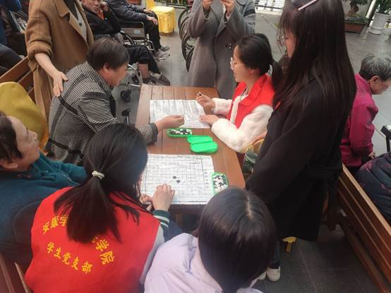 活动当天下午14:30,太阳成集团tyc33455志愿者们准时在汉水阳光怡养院集合,随后马勇明确了活动的目的和注意事项。敬老院的负责人也发表了热情洋溢的讲话,对志愿者们的到来表示热烈欢迎,并希望此次活动能够增进老人们与社会的联系,让他们感受到社会的温暖。紧接着,员工们为老人们献上了一场场精彩的文艺节目表演。优美的舞蹈、动人的歌声、幽默的小品,赢得了老人们的阵阵掌声。随后来到了最令人感动的环节:“走近老人”活动。志愿者们每两人一组,和老人们下象棋和五子棋,与老人们聊天交流。在这个过程中,志愿者们耐心倾听老人们讲述过去的故事,分享自己的所见所闻,让老人们感受到了久违的快乐与温暖。活动最后,志愿者们同马勇一起教老人们学习手指舞,忙手忙脚的同学们和老人脸上都洋溢着笑脸,在阳光下显得柔和甜蜜。